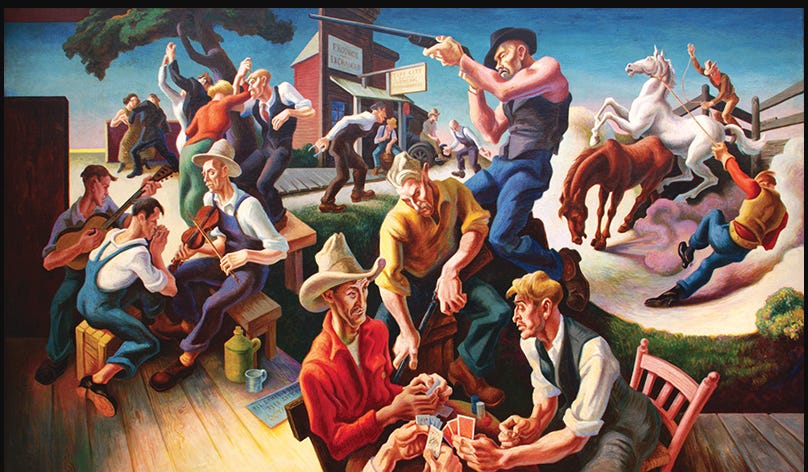 It’s hard to articulate just why Oklahoma feels to me, just as it did in 2019, like one of the Great American Works—it is in its many of these aforementioned pushes and pulls, in its innovations of the form that still feel fresh today, in the graceful and infectious turns of phrase and melody, in every song’s bittersweet, dreamy, and often funny gestures toward a better, different world. Tied to my initial exposure to the musical was a brief fixation I had on Regionalism, the Midwestern art movement from around the same period as the show that produced Grant Wood and Thomas Hart Benton, who might just as well have been painting episodes from Riggs’ play and the musical adapted from it: