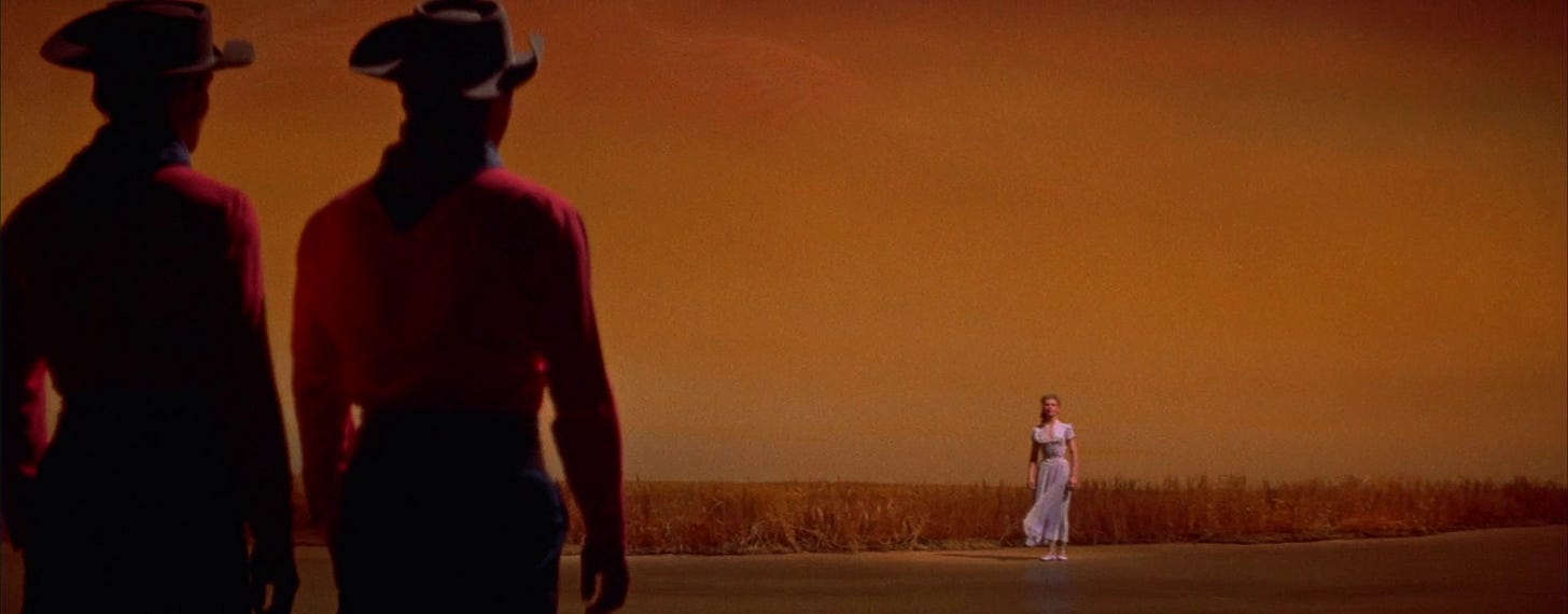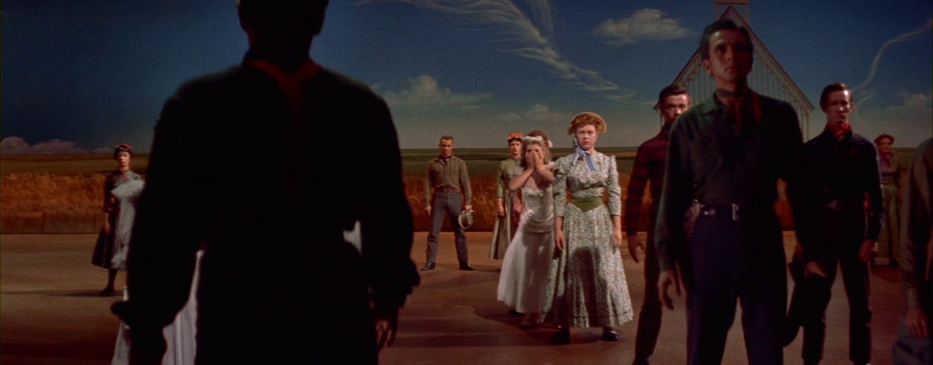 My personal favorite production to listen to has proved to be the 1998 West End revival starring Hugh Jackman…it just feels like it has the richest vocal performances, toeing the line well between the show’s optimism and underlying menace. The 1955 film adaptation is…not good. It has a smart combination of ravishing images shot in actual rural landscapes and painterly, impressionistic soundstages, and it stages some of the numbers beautifully (in particular the Dream Ballet, “Kansas City,” and “The Farmer and the Cowman”). All of this having been said, much of the film is made up of sequences of characters standing stock still and singing in long master shots; not the most engaging or inventive rendition of the material. But all in all, it’s not a total loss; it’s meaningful that it immortalizes Agnes de Mille’s choreography for the stage production; De Mille was brought in on the original production in large part due to her choreography for Aaron Copland’s ballet Rodeo a year or two prior. Her understanding and melding of frontier physicality with ballet is truly singular and beautiful, just another of the many rich dualities on display in the show. The film also deserves some props for containing images like this: